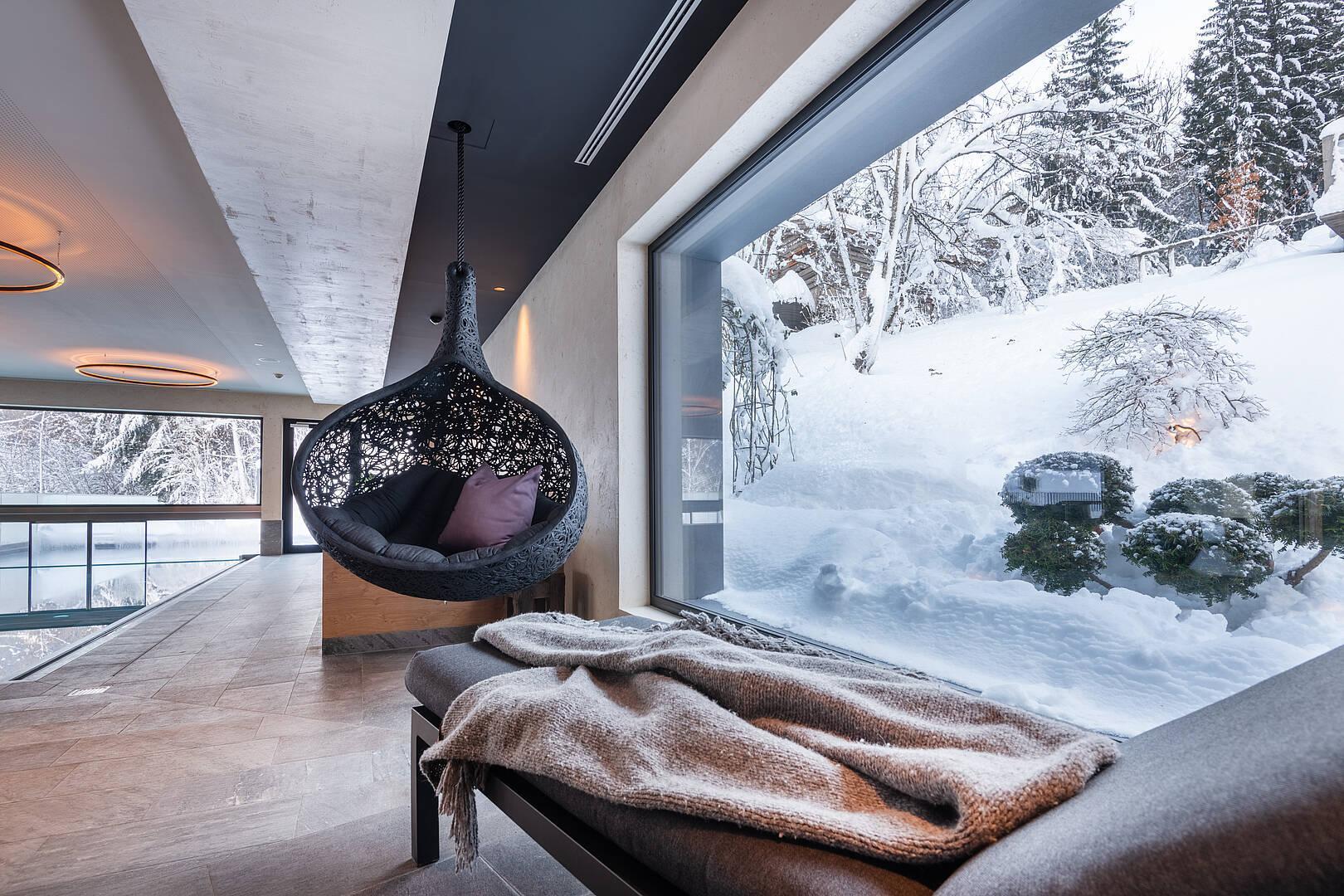 Große Liegen mit Blick in die Zillertaler Berge und in die Natur am Waldrand machen diese Plätze zu besonderen Rückzugsorten im Rooftop Spa. Ein Highlight für Kinder und Jugendliche sind die Hängelounges, die gerne zum Chillen und Relaxen genutzt werden.