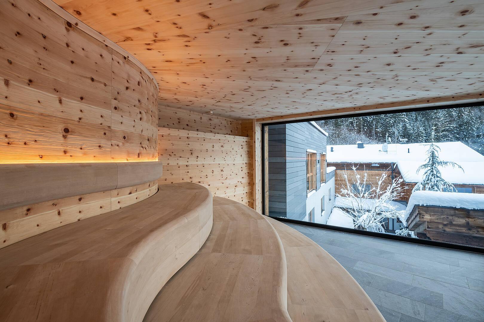 Die Sauna befindet sich in unmittelbarer Nähe zum Familienpool und zu den gemütlichen Ruhebereichen, sodass sich Baden, Wärme und Entspannung ideal miteinander verbinden lassen. Der angenehme Duft des Zirbenholzes schafft eine warme und beruhigende Atmosphäre und macht diesen besonderen Wellnessmoment für die ganze Familie noch intensiver.