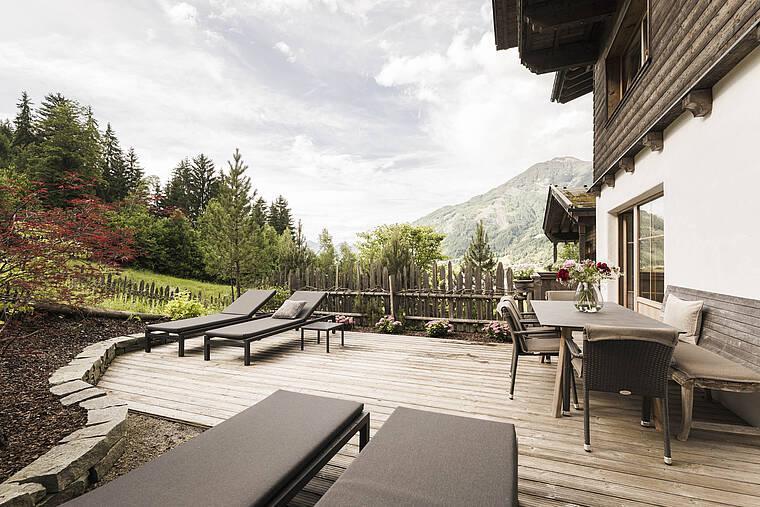 Hautnah. Die Natur spüren auf der großen Gartenterrasse. Ein feines Mikroklima am Bergbach und Jungwald einfach genießen.