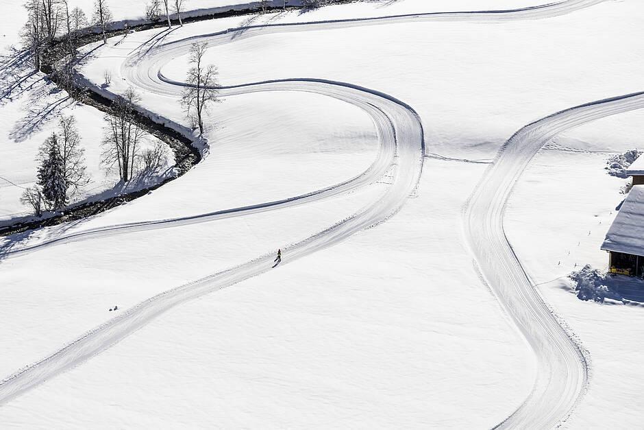 The most scenic cross-country trail in the Zillertal is located in the Zillertal Arena near Gerlos, in the picturesque Schönachtal. At an altitude of 1,200 meters, the 6 km snow-sure trail winds through breathtaking natural landscapes. A special highlight: 1.5 km of the trail are illuminated from 5:00 PM to 10:00 PM, allowing you to enjoy the magical winter scenery even at night.